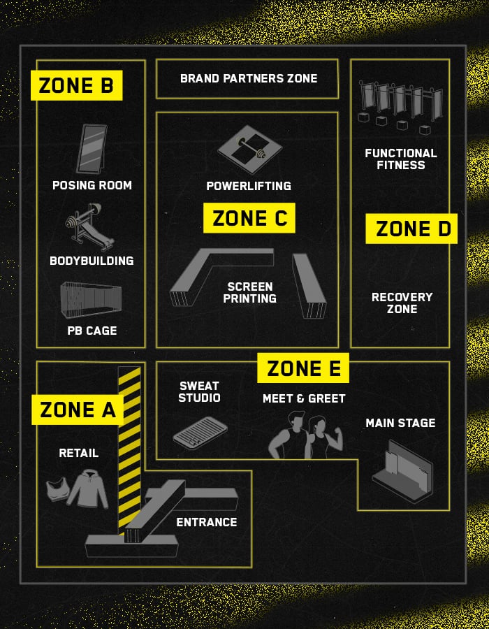 Each zone has its own character, its own cohort of athletes, and its own special attractions. From PB Cages and Posing Rooms for our lifters in Zone B, to powerlifting platforms, and functional fitness apparatus in Zones C-D, this is unlike anything we've ever done before.